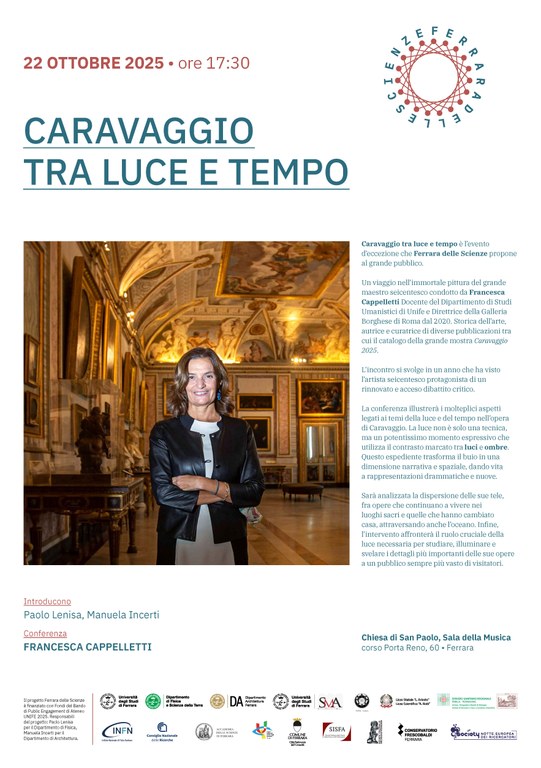 Caravaggio tra luce e tempo è l’evento d’eccezione che Ferrara delle Scienze propone al grande pubblico. Un viaggio nell’immortale pittura del grande maestro seicentesco condotto da Francesca Cappelletti Docente del Dipartimento di Studi Umanistici di Unife e Direttrice della Galleria Borghese di Roma dal 2020. Storica dell’arte, autrice e curatrice di diverse pubblicazioni tra cui il catalogo della grande mostra Caravaggio 2025.