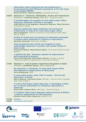 Tanti gli interventi che si sono succeduti: dal contesto normativo e istituzionale (relatori di JRC- ISPRA, ISS, Utilitalia, ARPAE, ATERSIR), alle tecnologie consolidate e innovative per affinare l’effluente secondario e renderlo idoneo al riuso senza prescrizioni (interventi di Veolia, Xylem, Università di Catania e Università di Ferrara), alla gestione, affidabilità e valutazione dei rischi (interventi di Università di Catania, Istituto Mario Negri, Politecnico di Milano, Università Politecnica delle Marche, Gruppo di Lavoro Gestione Impianti di depurazione, Università di Brescia) per terminare con la presentazione di casi di studio su scala reale da parte dei gestori IREN, MM SpA, HERA SpA e Gruppo CAP.
