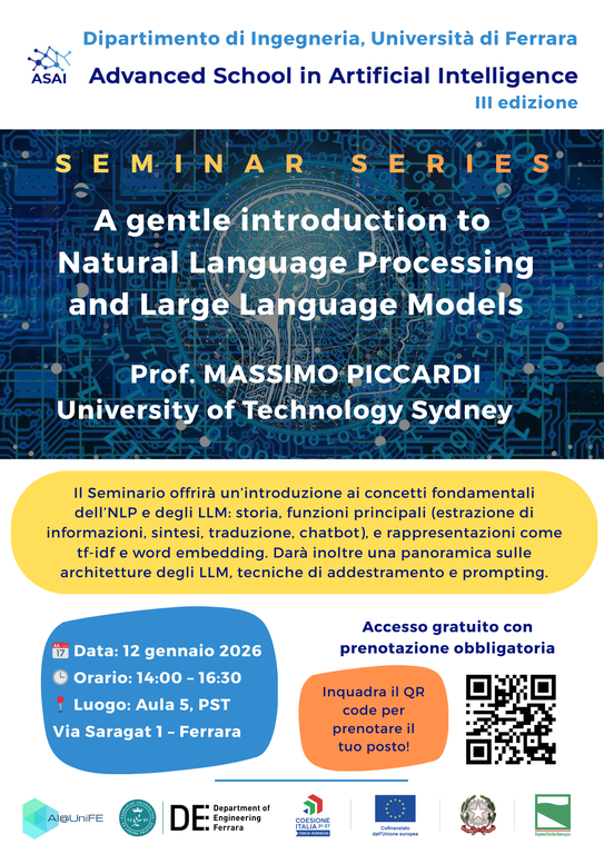 Lunedì 12 gennaio 2026 sarà ospitato il Prof. Massimo Piccardi, figura di rilievo internazionale nei settori del Natural Language Processing, Computer Vision e Machine Learning.