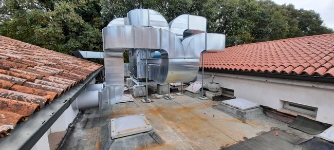 Particolare dell'apparato di ventilazione meccanica sul tetto del Dipartimento di Architettura