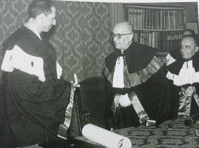 Ferrara, 16 giugno 1956 - Aldo Daccò riceve dal Magnifico Rettore dell’Università, Prof. Felice Gioelli, la Laurea in Chimica Honoris Causa, nella sala del Palazzo Paradiso.