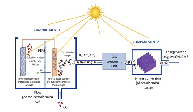 Schema di funzionamento del dispositivo di conversione solare della CO2 in combustibili. Al compartimento 1 un fotoanodo  assorbe la porzione ad alta energia dello spettro solare per innescando il processo di conversione: gli elettroni estratti da donatori elettronici (acqua o biomasse) sono utilizzati al catodo per produrre una miscela di CO e idrogeno (gas di sintesi) convertito al comparto 2 da particolari catalizzatori a base di silicio e metalli. Il prodotto finale è il metanolo o il prodotto di disidratazione dello stesso, il dimetiletere.