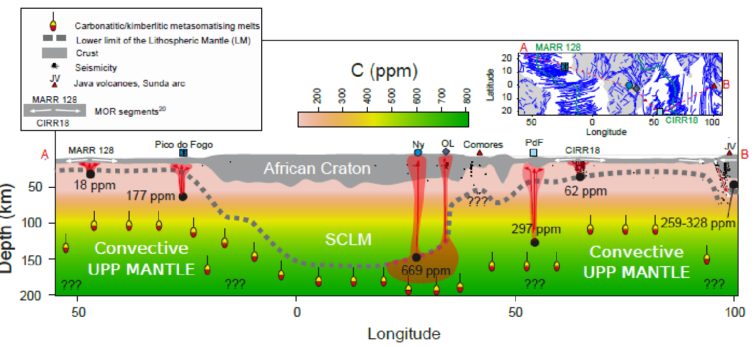 Sezione schematica dall’Oceano Atlantico all’Oceano Indiano (passando attraverso il cratone Africano), che mostra le variazioni nelle concentrazioni di Carbonio ricostruite nelle sorgenti di mantello da cui sono prodotti i magmi delle Isole Oceaniche e dei Rift Continentali.