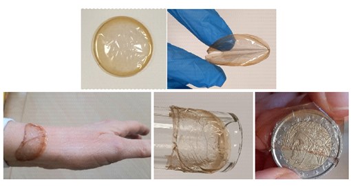La pellicola di fibroina di seta con incorporate le nanoparticelle magnetiche, allo stato secco (a). Le nanoparticelle di ossido di ferro conferiscono la particolare colorazione arancione al materiale (la sola matrice di fibroina di seta risulta bianca e totalmente trasparente). La pellicola si autosostiene e, se maneggiata, poi riprende immediatamente la sua forma iniziale (b). Dopo essere stata immersa in acqua per alcuni minuti, la pellicola aderisce facilmente a materiali di diverso tipo (c-e). Immagine adattata da [2] sotto licenza CC BY 3.0.