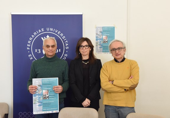 Un momento della conferenza stampa di presentazione. Da sinistra Giuseppe Scandurra, Coordinatore del Laboratorio per la Pace di Unife, la Rettrice Unife Professoressa Laura Ramaciotti e Alfredo Mario Morelli, Coordinatore del Laboratorio per la Pace di Ateneo.