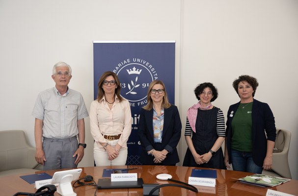 Un momento della conferenza stampa di presentazione del progetto: da sinistra Renato Gerdol, la Rettrice di Unife Laura Ramaciotti, Chiara Scaramagli, Lisa Brancaleoni, Elena Cavalieri