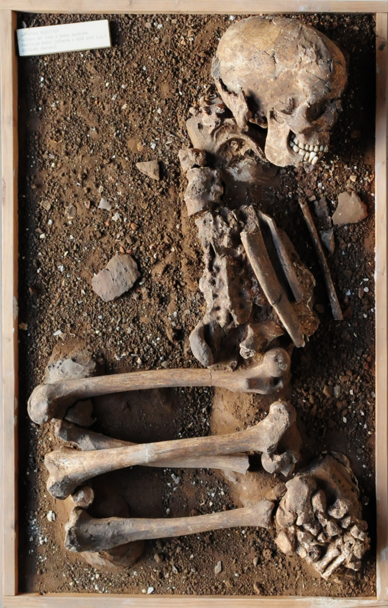Ricostruzione di una sepoltura ad inumazione del Neolitico medio (Cultura dei Vasi a Bocca Quadrata, IV millennio a.C.) da Quinzano, Verona. Gli scheletri provenienti dalla necropoli di Quinzano erano posti rannicchiati in fosse semplici, spesso ricoperte da cumuli di pietre. I corredi erano composti nella maggior parte dei casi, oltre che dai caratteristici recipienti a bocca quadrata, da strumenti in selce e accette in pietra levigata.
