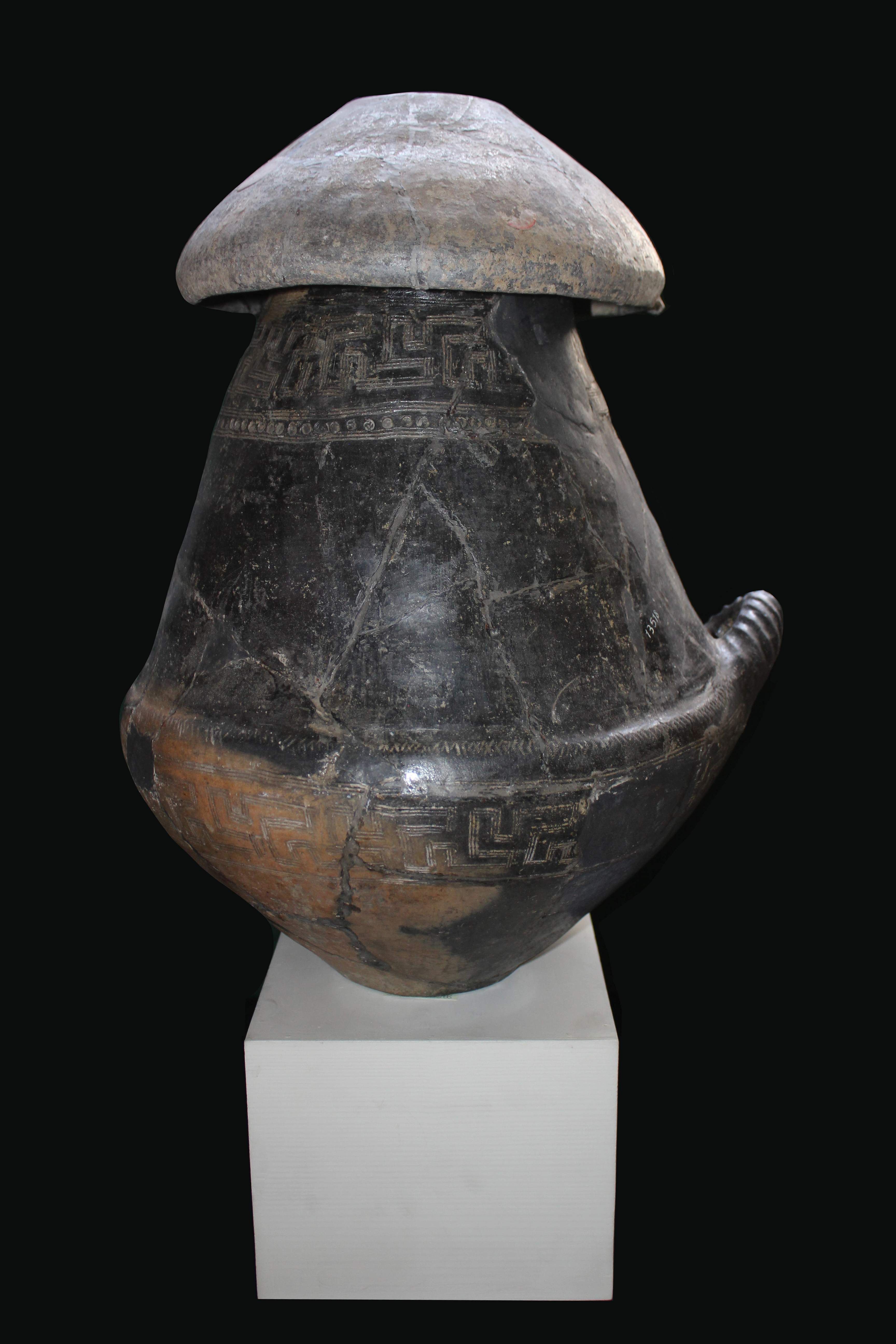 Ossuario biconicoOssario, dalla tipica forma biconica, ricoperto da una scodella rovesciata con funzione di coperchio. Destinato a contenere i resti combusti del defunto, rappresenta l'oggetto più caratteristico della cultura villanoviana. Nelle necropoli villanoviane del bolognese il rito prevalente era, infatti, quello della cremazione: l'ossuario biconico nel quale venivano raccolte le ceneri risultanti dal rogo su cui veniva bruciato il defunto era successivamente deposto in una buca rivestita da ciottoli ("tomba a pozzetto") o da lastre di pietra ("tomba a cassetta"). La presenza della tomba era segnalata da un cippo funerario, spesso costituito da un semplice sasso di fiume o da una lastra di pietra. |